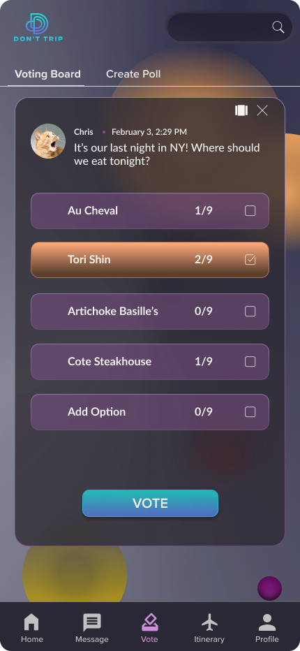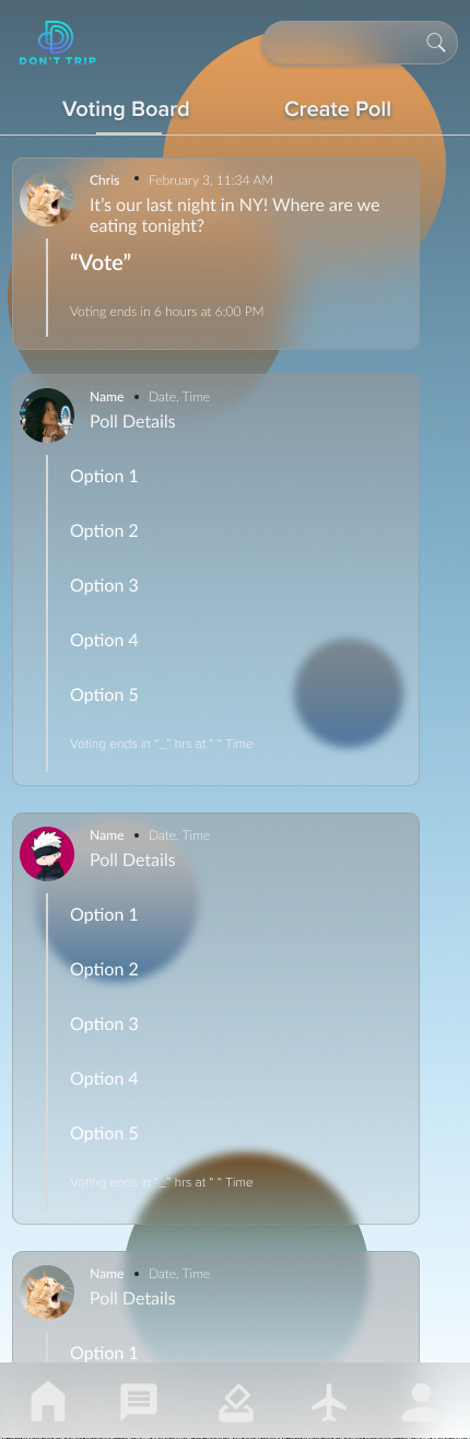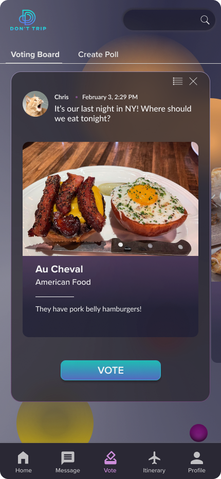 Glassmorphism is the intended style approach for this product. It’s modern and trendy to target a young adult demographic, and the look easily lends itself to messages and voting that can be formatted and organized via cards.