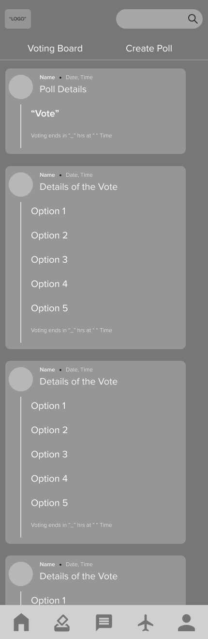 The overall UI structure allows for the most recent polls, messages, and images to appear first, a feature similar to current social media trends. A section on the landing page is meant to stay permanent, and is set there as a hub for users to edit real-time reminders to themselves and other party members.