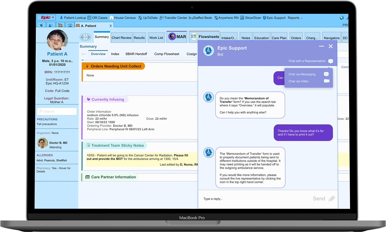 Support chat is located on the right most side, as to keep patient information visible on the left.